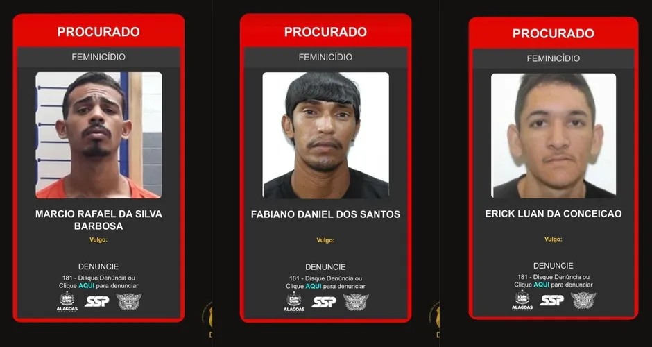 A Polícia Civil de Alagoas procura três homens suspeitos de cometer feminicídios na parte alta de Maceió. Márcio Rafael da Silva Barbosa, Erick Luan da Conceição e Fabiano Daniel dos Santos foram incluídos na plataforma digital de mais procurados da Secretaria de Estado da Segurança Pública (SSP) e estão foragidos da Justiça.
