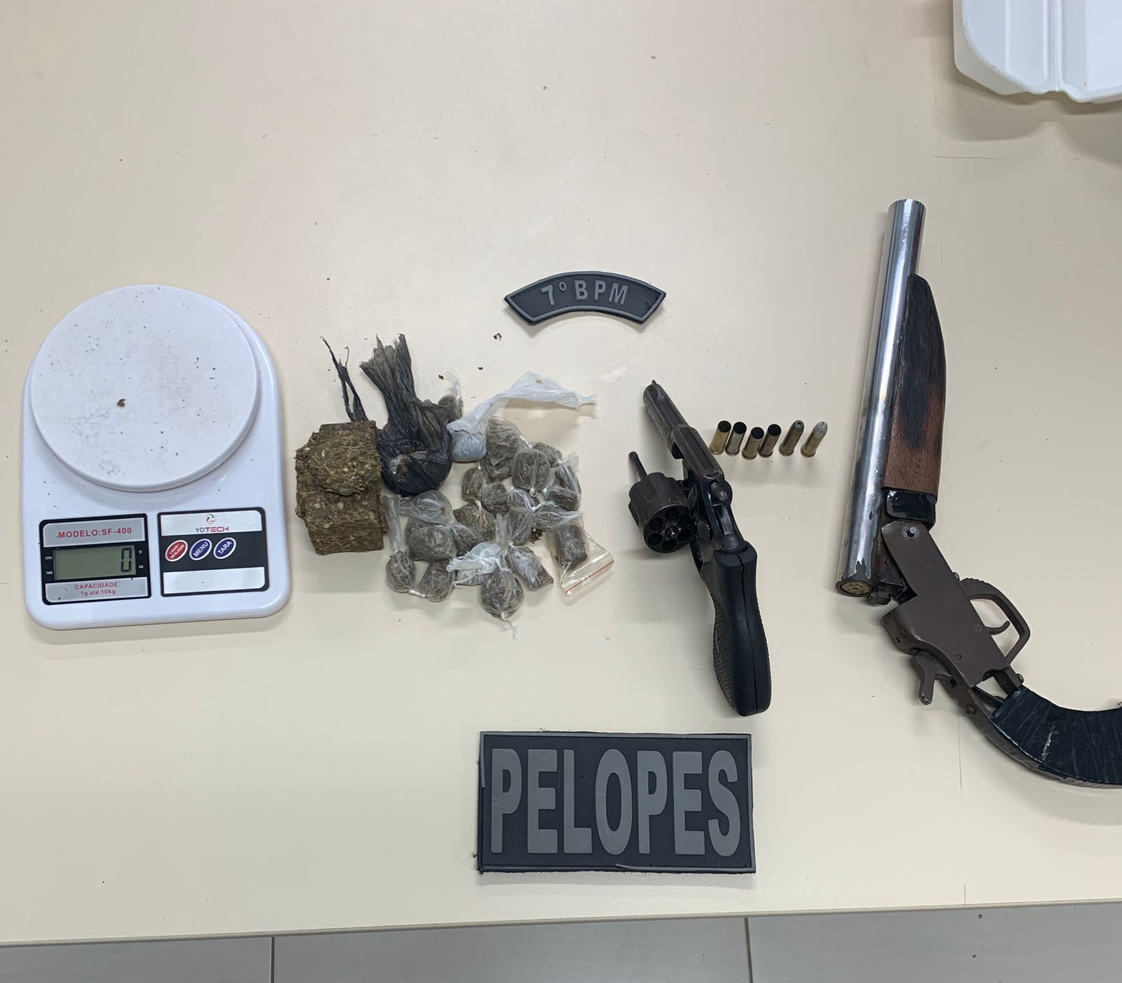 Junto a Paulo Vítor e Yslam Ironaldo foram encontrados um revólver, uma espingarda de fabricação caseira e drogas.