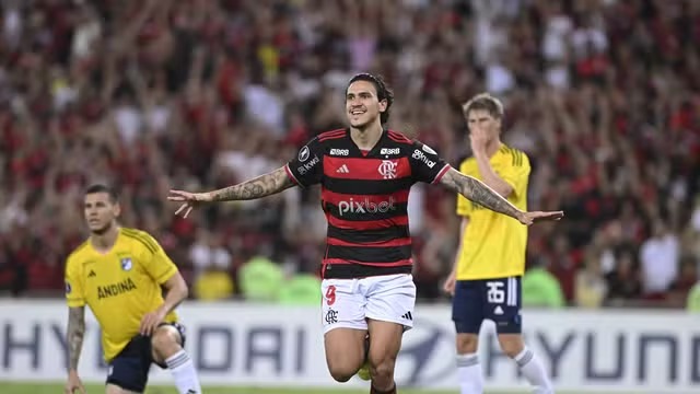 Pedro, do Flamengo, comemora gol contra o Millonarios (Foto: André Durão)