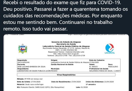 Luciano Barbosa afirmou também que está seguindo as orientações médicas e que vai continuar trabalhando de forma remota.