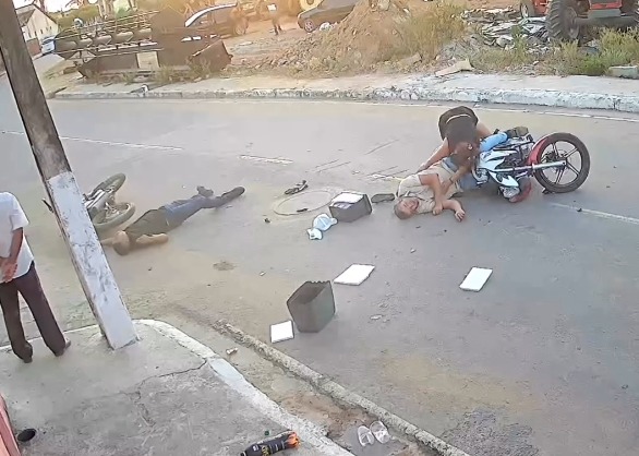 Um acidente grave envolvendo duas motocicletas foi registrado na manhã deste domingo (23) na Rua Frei Damião, área central de Craíbas, no Agreste de Alagoas. Imagens de câmeras de segurança instaladas na via flagraram o exato momento da colisão, mostrando a força do impacto e a queda imediata dos condutores.