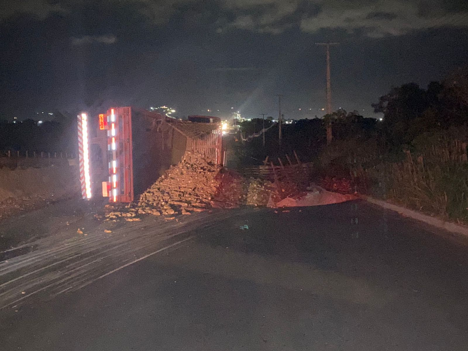 Na noite desta quinta-feira (19), um caminhão carregado de mandiocas tombou na rodovia AL-115, próximo ao povoado Santo Antônio, antigo Gavião. O veículo virou após colidir com a mureta de duplicação da pista. Ninguém ficou ferido.