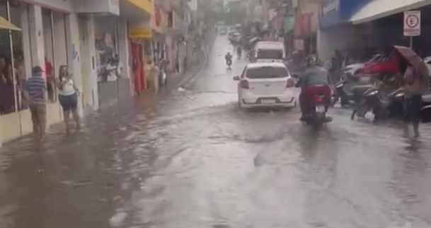 [Vídeo] Chuvas alagam trecho de rua de Palmeira dos Índios e dificultam passagem de pedestres