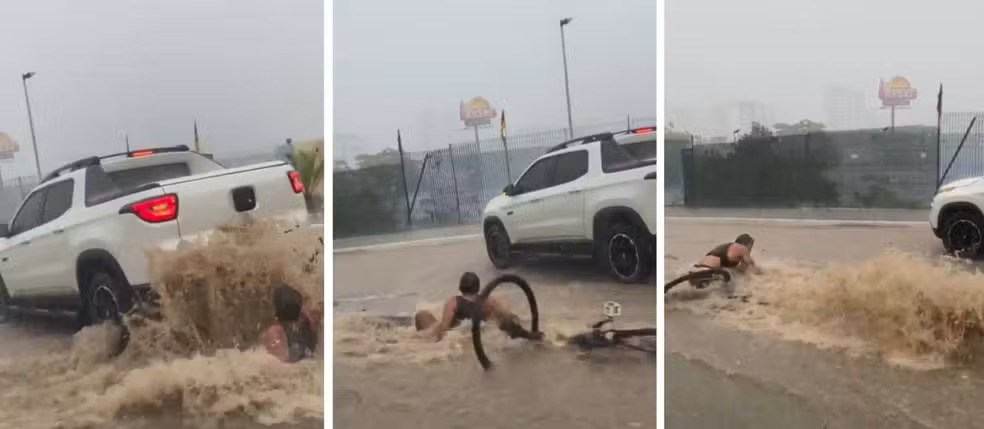 Em seguida, o ciclista consegue sair. Ele tenta se levantar, mas é arrastado pela correnteza junto com a bicicleta. Não há informações sobre o estado de saúde dele.