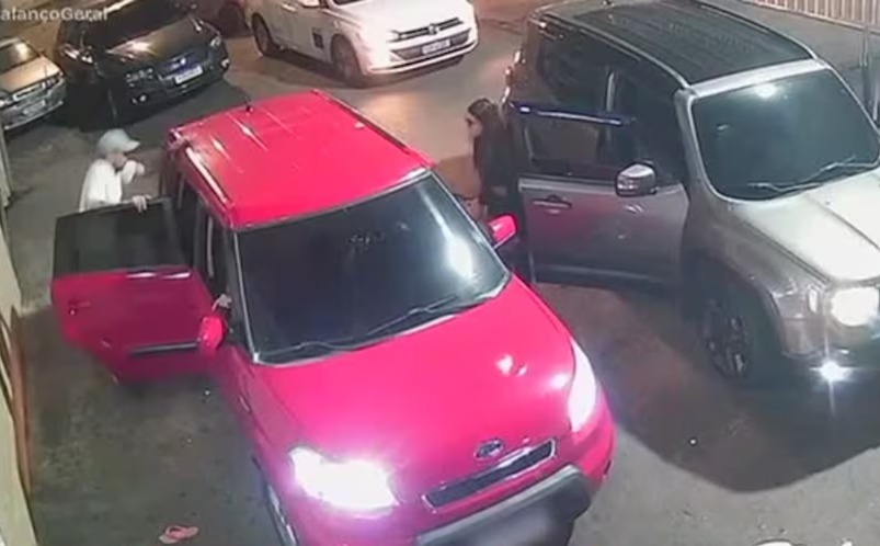 Câmeras de monitoramento registraram o momento em que ele desce do carro, corre em direção à vítima e a ataca com uma voadora e vários chutes, enquanto ela estava encostada ao lado de seu veículo.