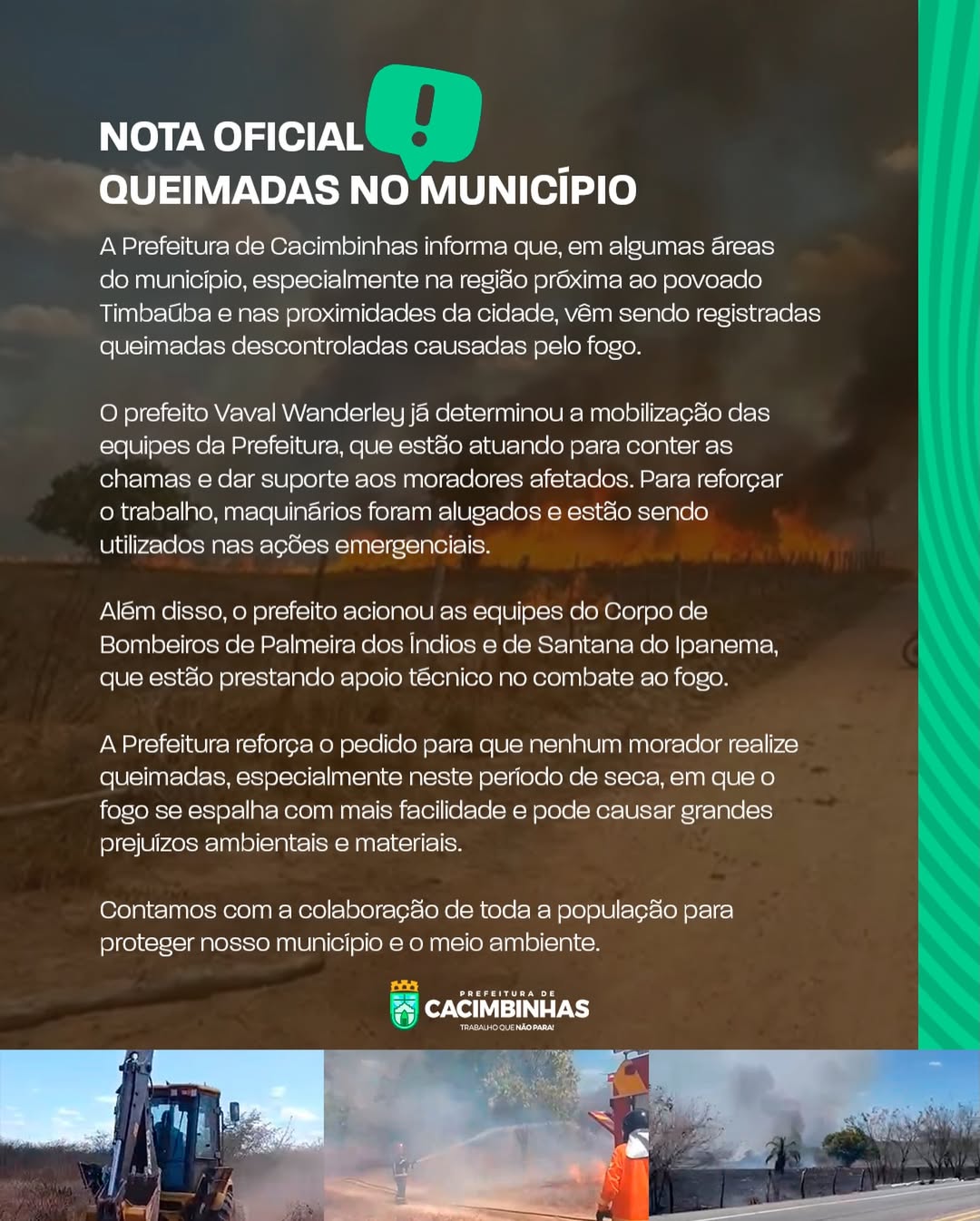 De acordo com nota oficial da Prefeitura de Cacimbinhas, equipes municipais estão mobilizadas para conter as chamas que atingem áreas rurais e já se aproximam da cidade. O prefeito Vaval Wanderley determinou a mobilização de maquinários e equipes de apoio para reforçar as ações emergenciais, além de acionar o Corpo de Bombeiros de Palmeira dos Índios e de Santana do Ipanema, que prestam suporte técnico no combate ao fogo.