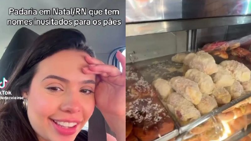 Duda Vieira, influenciadora de fitness, se diverte com pão com nome inusitado em padaria de Natal, gerando risadas e viralização - Foto: Reprodução/Redes Sociais