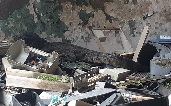 Um jacaré foi encontrado na manhã desta segunda-feira (3) em um depósito abandonado próximo ao antigo Posto Padre Cicero, no Centro de Palmeira dos Índios.
