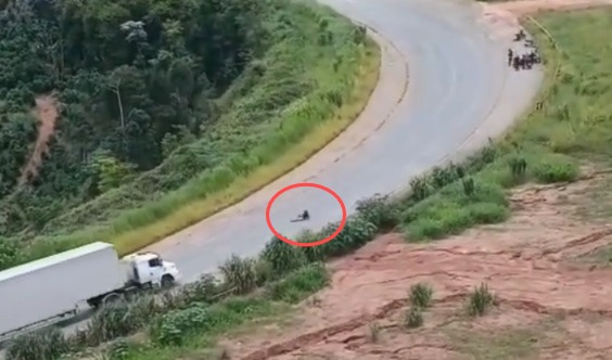 Durante a manobra, o motociclista perde o controle da direção e cai na pista. A situação se torna ainda mais tensa quando uma carreta, que trafegava no sentido contrário, surge logo à frente e, por questão de centímetros, não atinge o homem, evitando o que poderia ter sido uma tragédia.