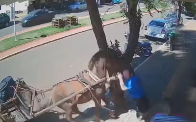 O animal estava parado tracionado em uma carroça. Caso aconteceu na manhã de sábado (2) no Centro da cidade. Câmeras de monitoramento registraram o momento do ataque.