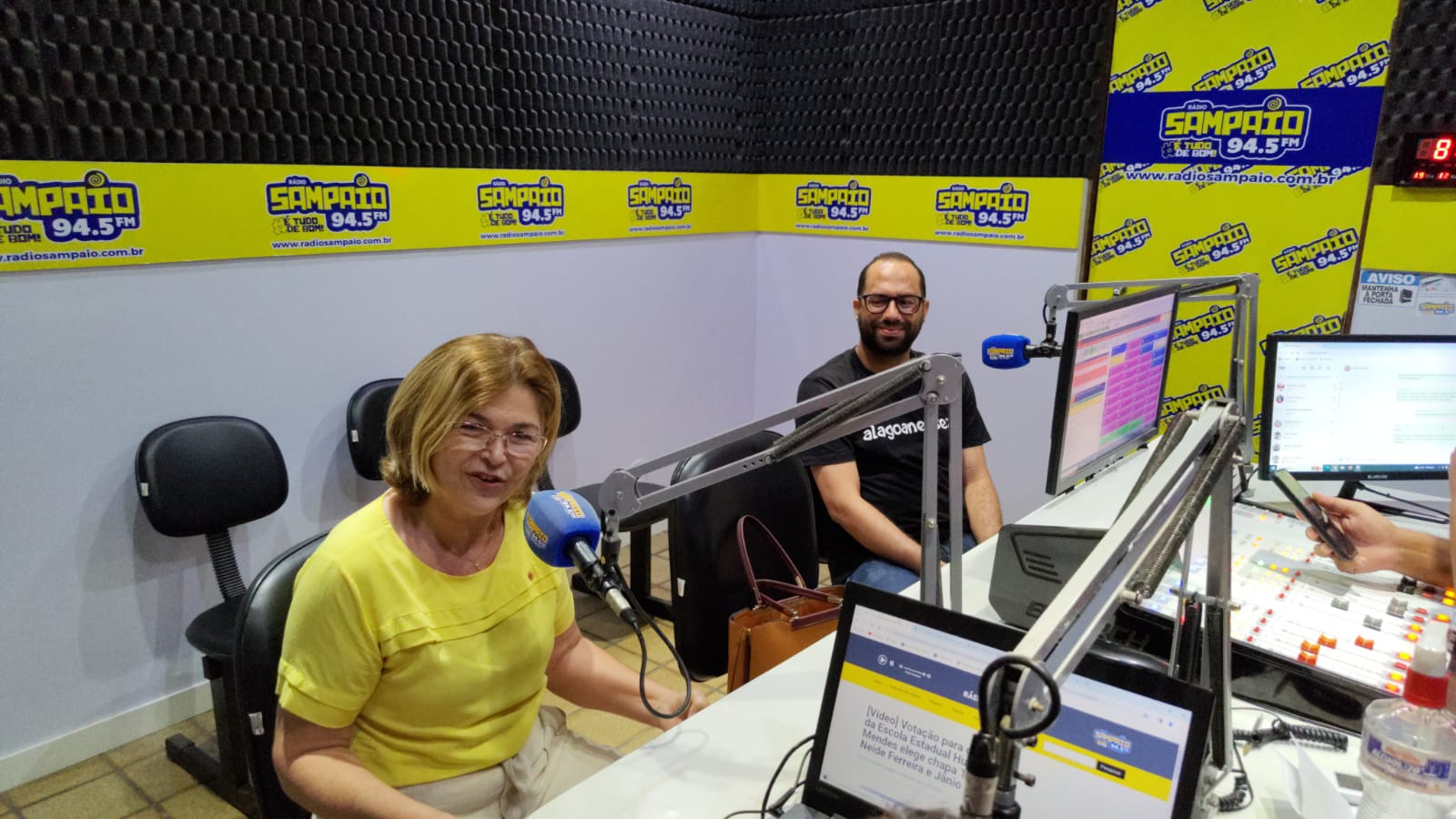 A profª. Neide e o prof. Jânio, que integraram a chapa 1, durante entrevista no estúdio da Rádio Sampaio | Foto: Pedro Ivon/Portal Rádio Sampaio