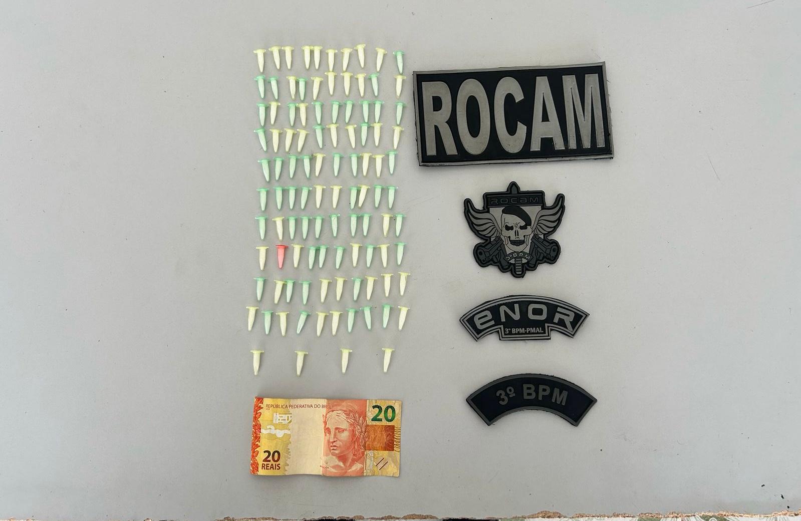 Material Apreendido: 104 pinos de cocaína e R$ 20,00 em espécie.