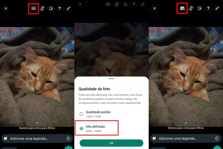 Para usufruir dessa nova opção, basta atualizar o aplicativo de mensagens e fazer o procedimento comum para envio de imagens, selecionar uma foto em alta resolução e pressionar a opção “HD” que estará disponível no topo da tela, junto às opções de edição.